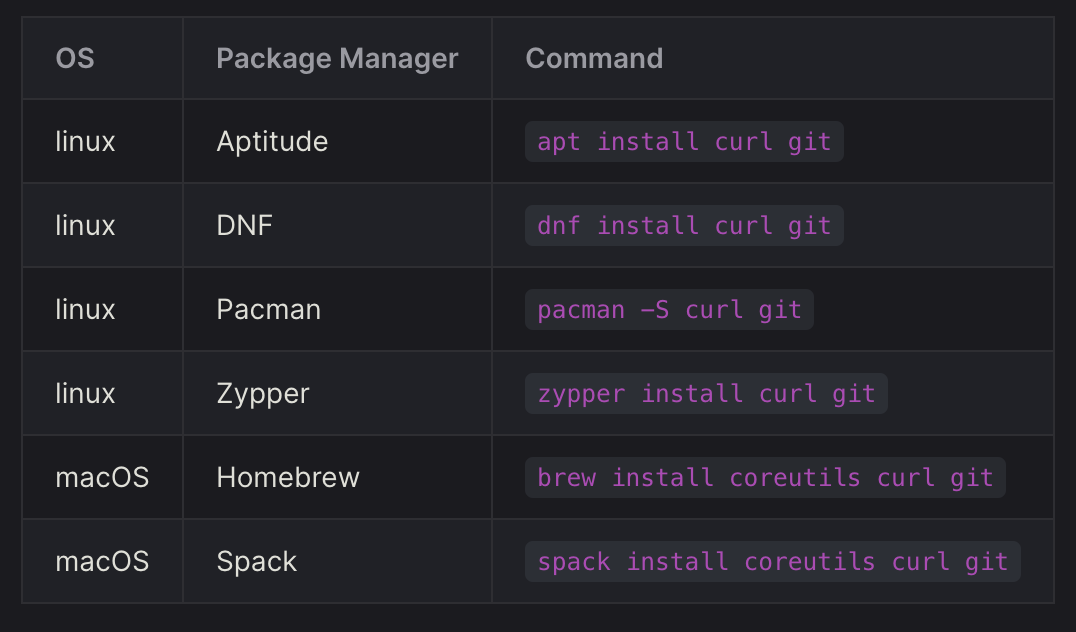 asdf 는 주로 git과 curl 을 요구한다. 사용자의 패키지 매니저를 구동하기 위해 아래 전체 커맨트 리스트가 있다.(몇몇은 이후 단계에서 자동으로 설치될 수 있다.)